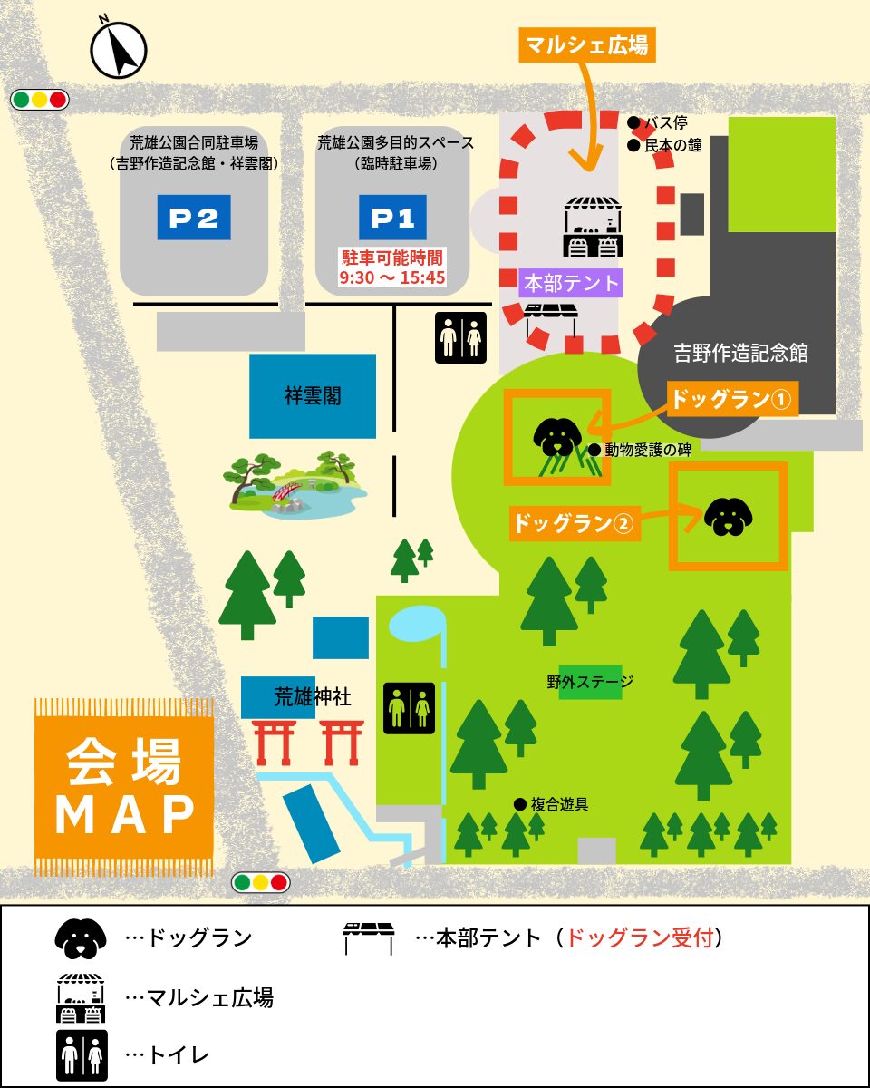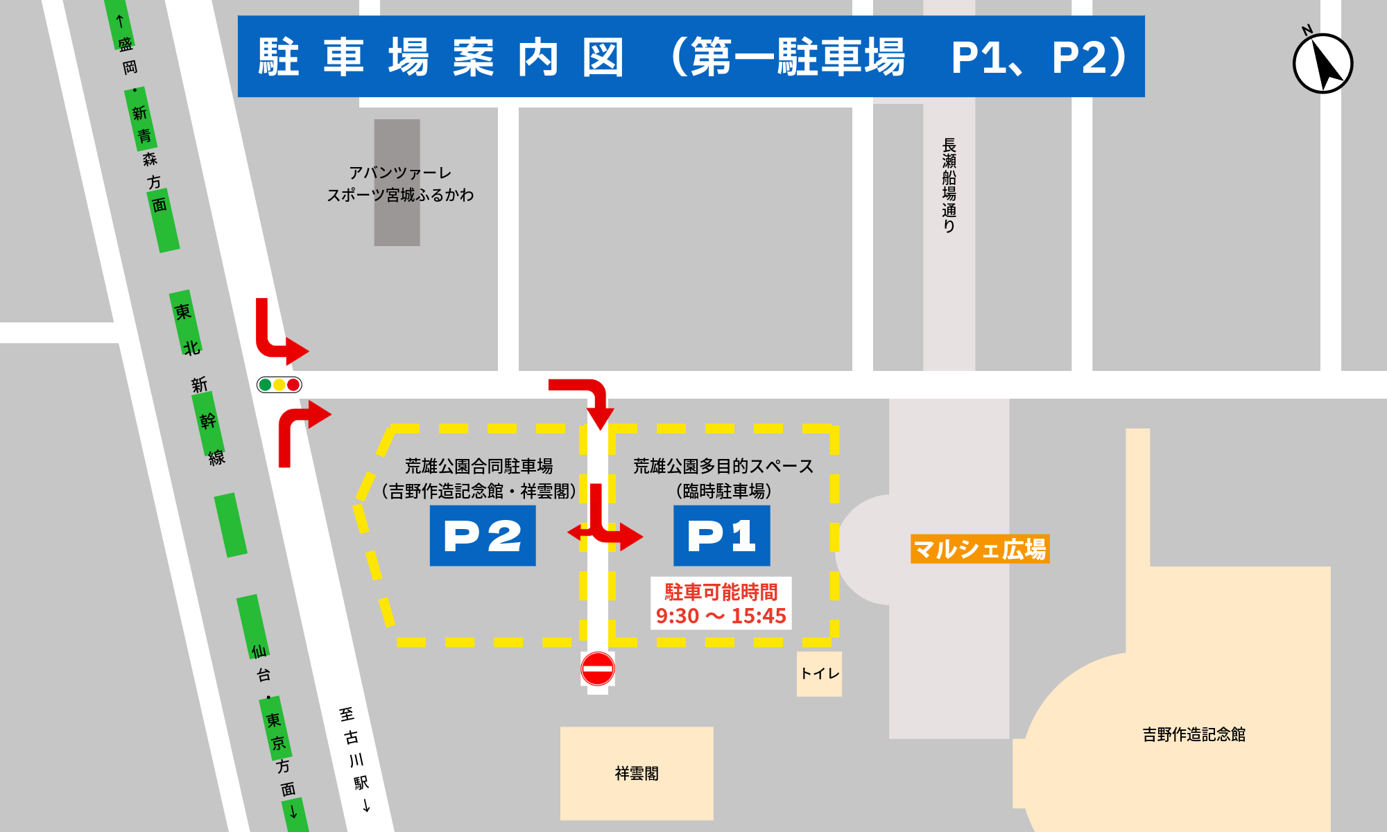※[P1]は当日限りの臨時駐車場となっており、駐車可能時間は9:30~15:45までとなっておりますのでご注意ください。また、駐車可能時間を超えて駐車されますと撤収作業などに影響がありますので、時間順守にご協力をお願いいたします。