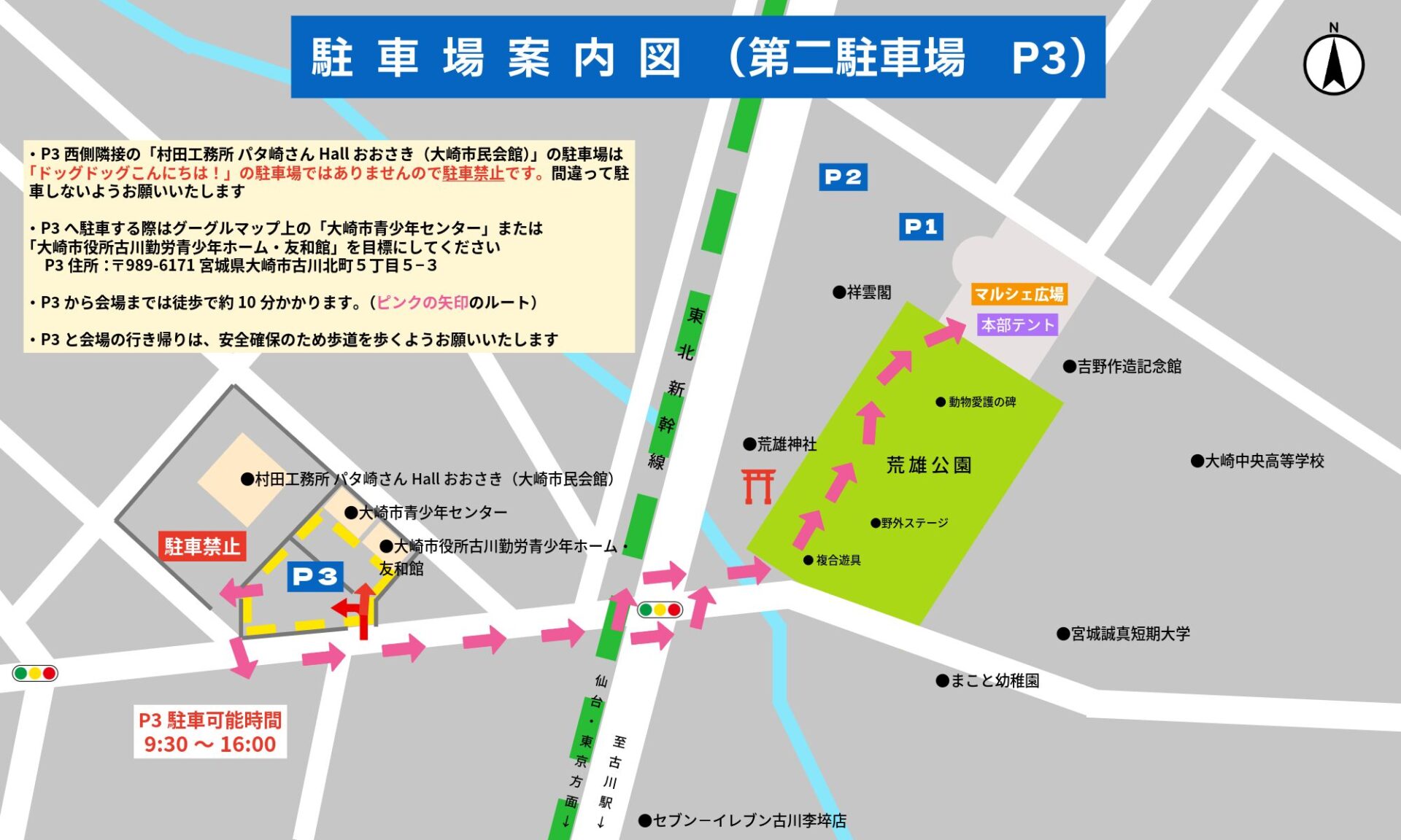 ※[P3]は当日限りの臨時駐車場となっており、駐車可能時間は9:30~16:00までとなっておりますのでご注意ください。また、駐車可能時間を超えて駐車されますと撤収作業などに影響がありますので、時間順守にご協力をお願いいたします。